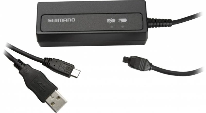Battery charger with USB cable for Shimano’s SM-BTR2 Li-Ion battery. You can only connect the charger to a SM-EW90-A or SM-EW90-B power distributer. The SM-BCR2 is also an interface for the Shimano E-Tube configuration software.