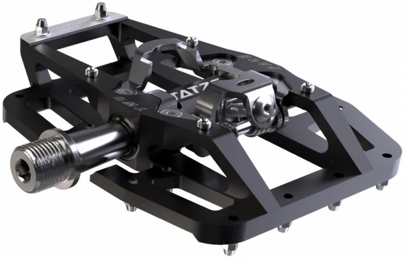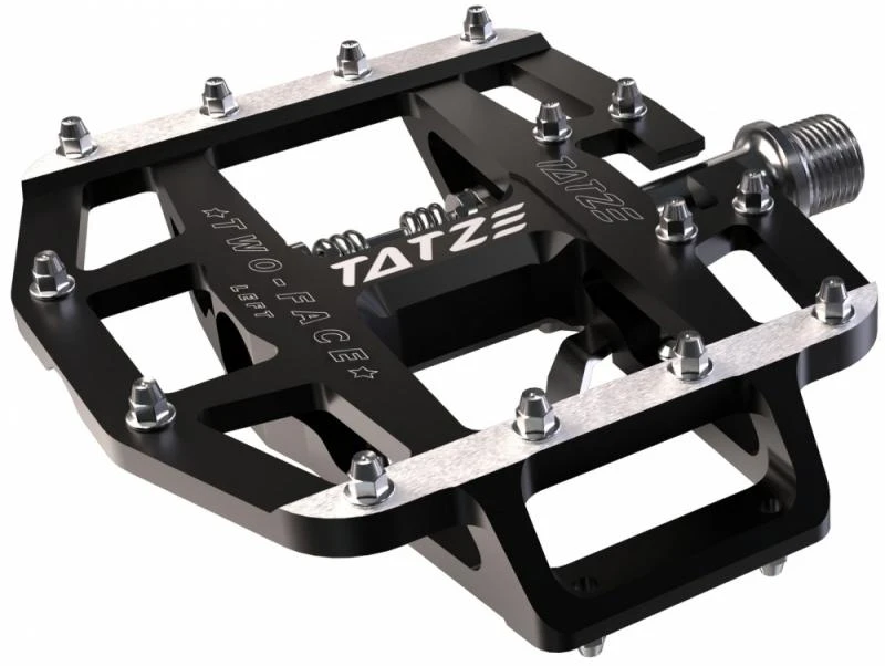 The Tatze Two-Face Pedal is an extremely potent folding pedal and an efficient click pedal at the same time. The 14 PINs with targeted cant on the flat side ensure enormous grip, but also on the click side, 6 height-adjustable PINs create a particularly rich connection between pedal and shoe.